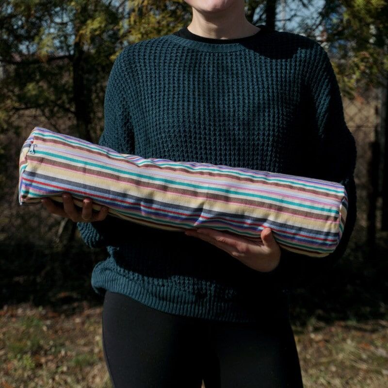 Wałek został uszyty z bardzo wytrzymałej bawełny z zamkiem kryjącym. Posiada wkład z łusek gryki i lawendy, który został umieszczony w płóciennej poszewce z zamkiem. W razie potrzeby można wyjąć wsad, a bawełnianą ozdobną poszwę uprać.