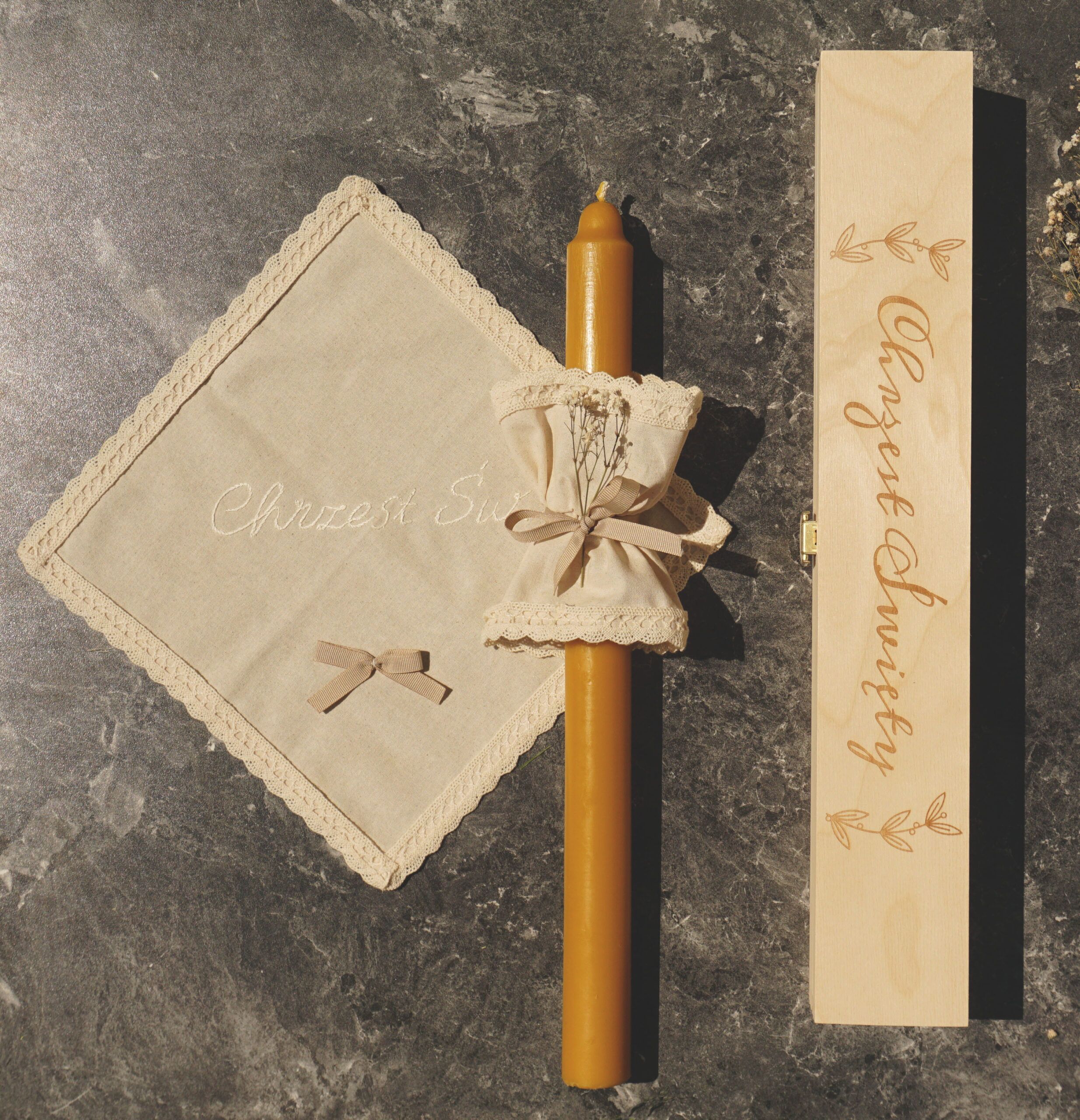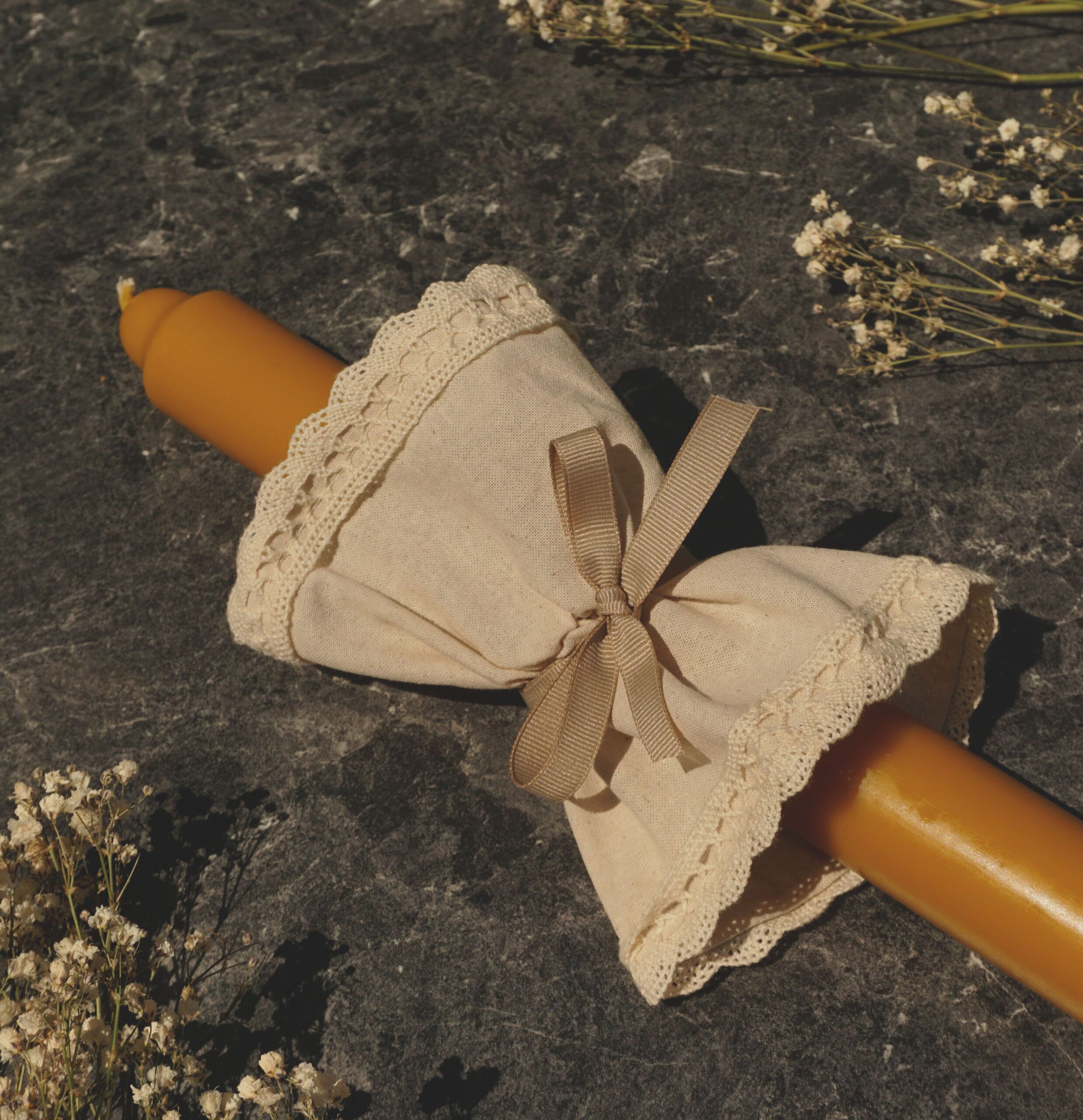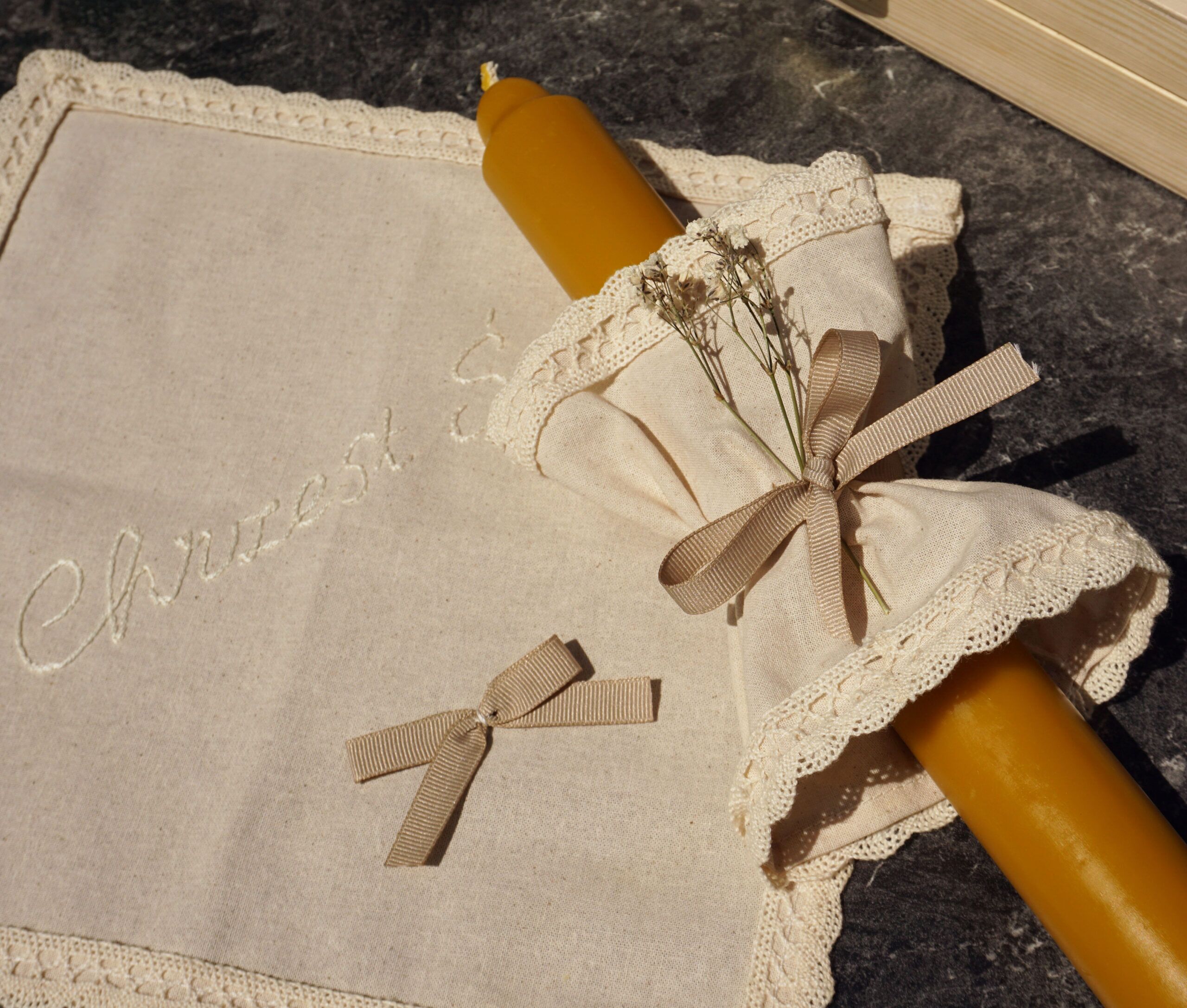 Gromnicę odlaliśmy z czystego wosku pszczelego, bez żadnych dodatków, poza bawełnianym knotem, który zapewnia dobre spalanie świecy. Dobraliśmy do niej ręcznie szyty kremowy bawełniany okapnik z koronkowym wykończeniem i rypsową tasiemką na środku. Ozdabiamy go suszoną gipsówką. Pani Magdalena z Fiu fiu pracownia uszyła dla nas także szatkę z ręcznie wyszywanym napisem „Chrzest Św.”