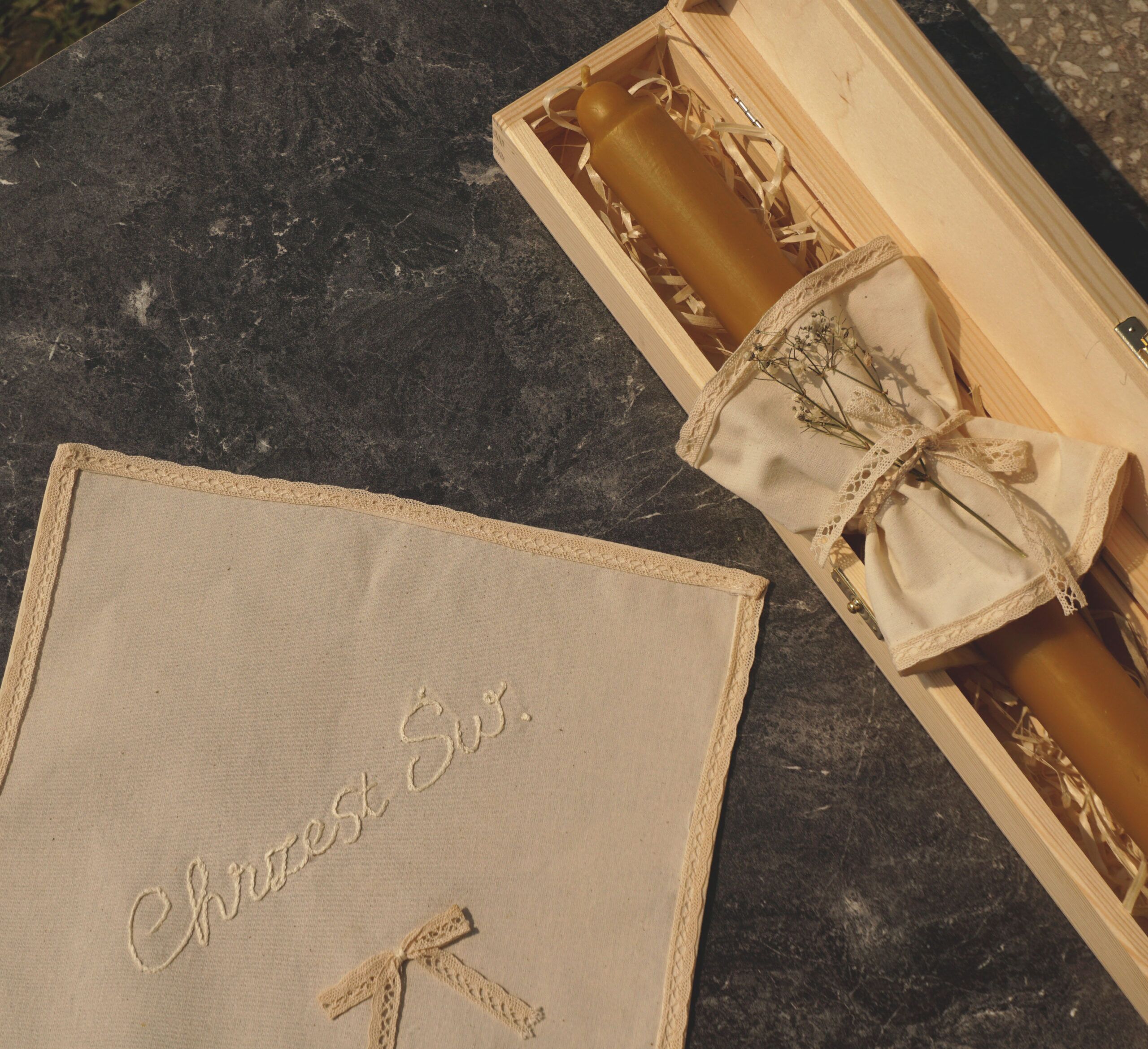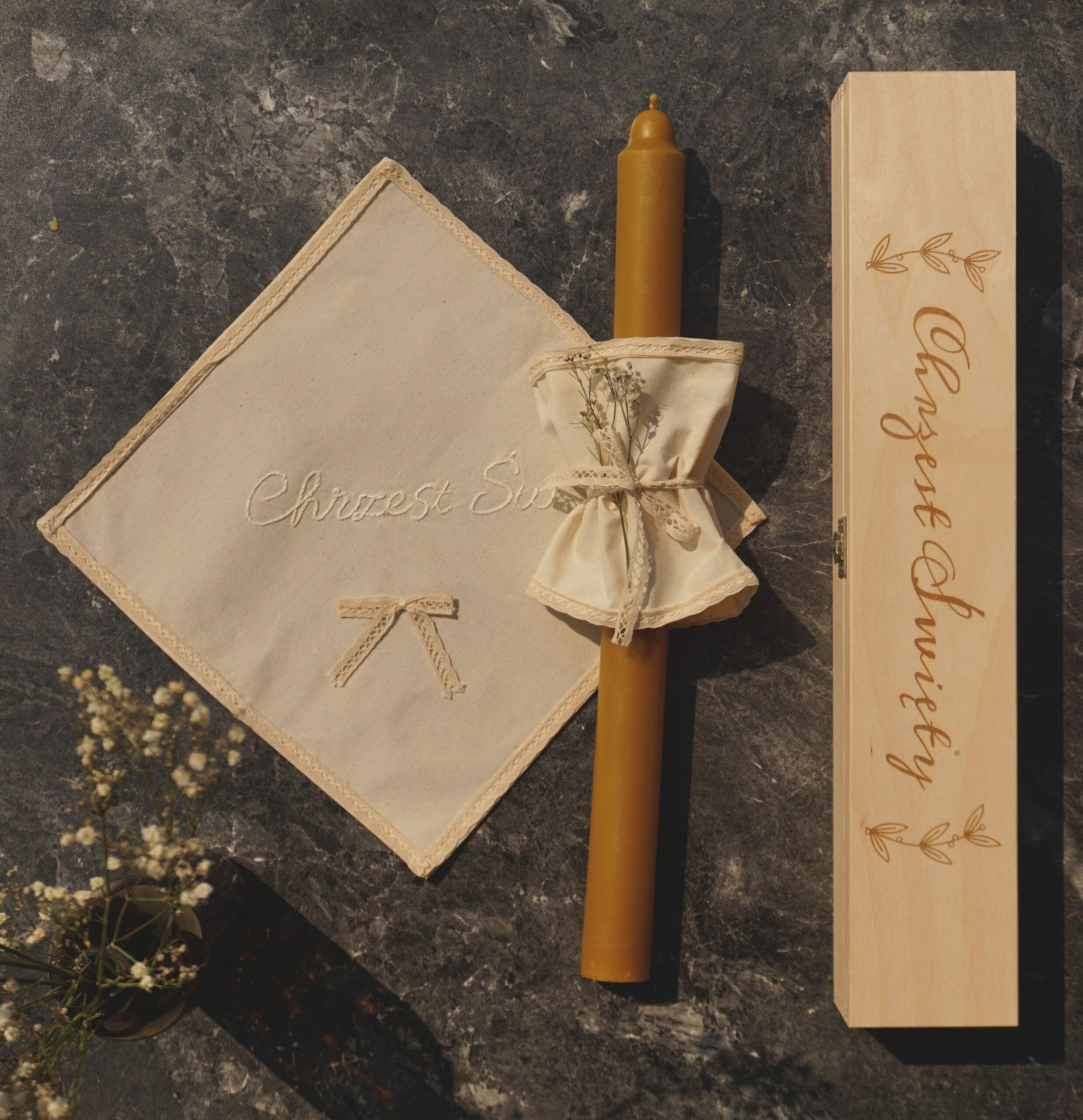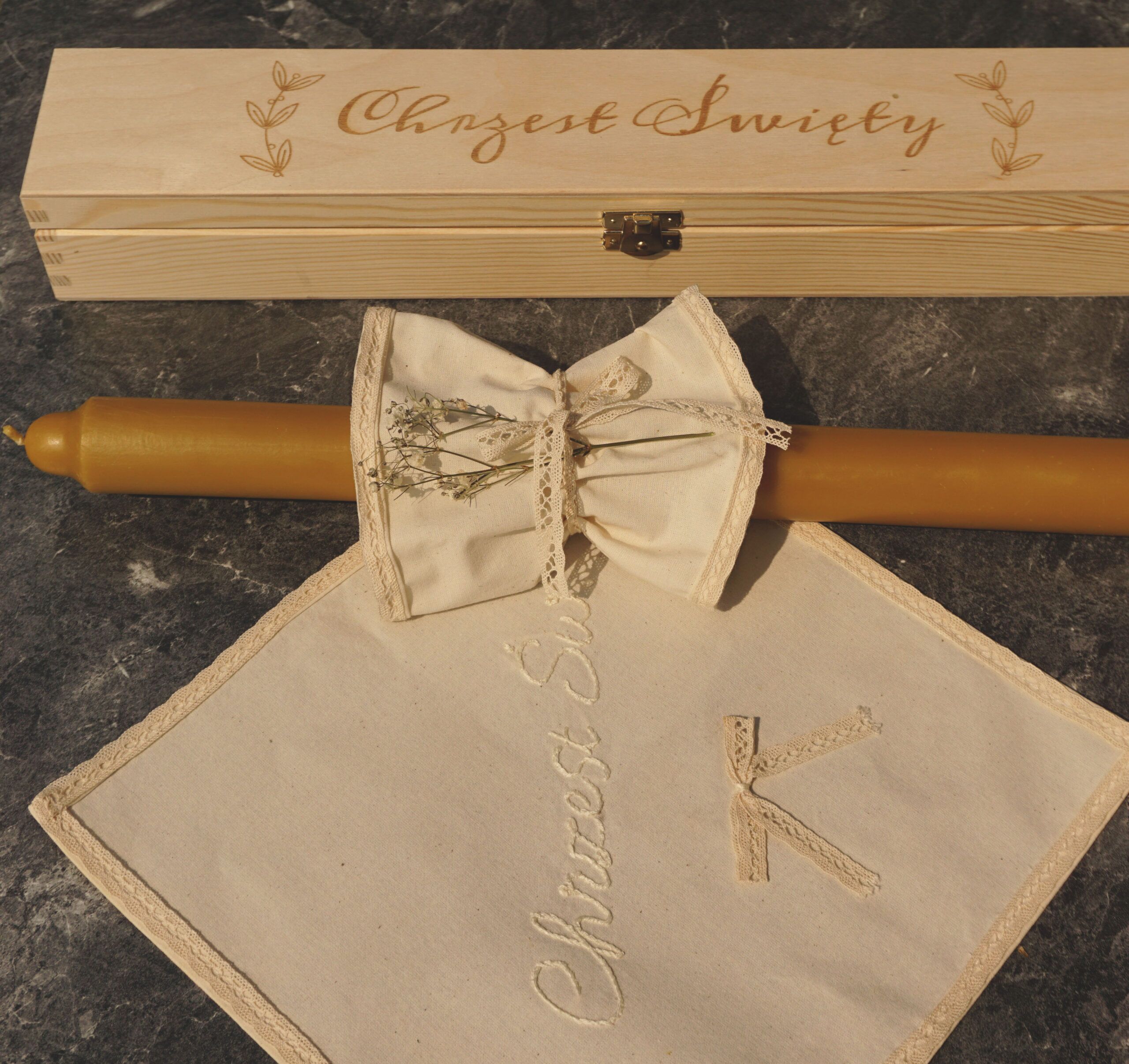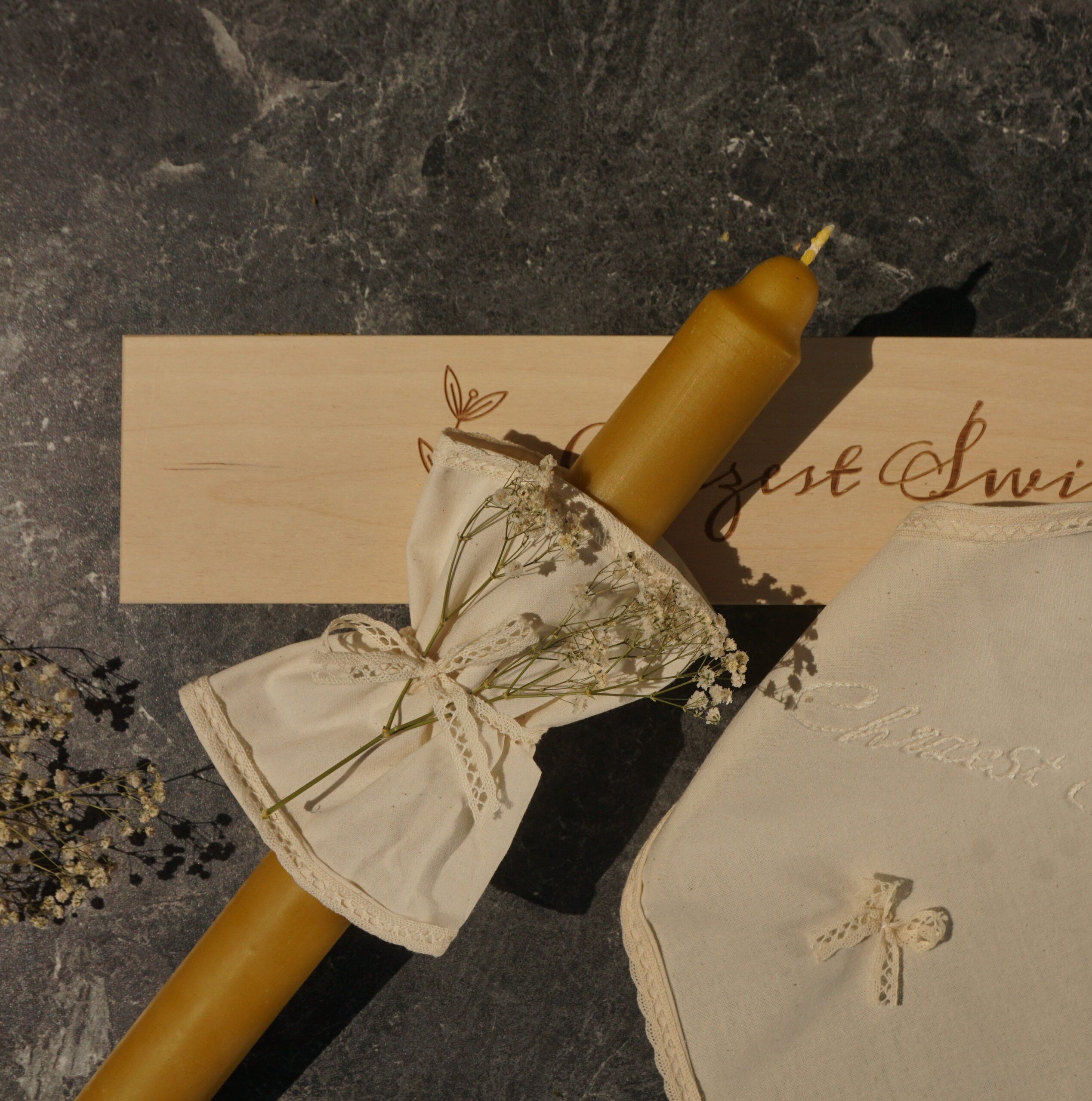 Świeca z bawełnianym knotem wykonana z czystego wosku pszczelego, bez żadnych dodatków. Dobrze komponuje się z ręcznie szytymi dodatkami – profitką i szatką z bawełny wykończonej koronką. My dodatkowo dodajemy suszoną gipsówkę, która dopełnia całość. Pani Magdalena z Fiu fiu pracownia ręcznie wyszyła na szatce napis “Chrzest Św.”