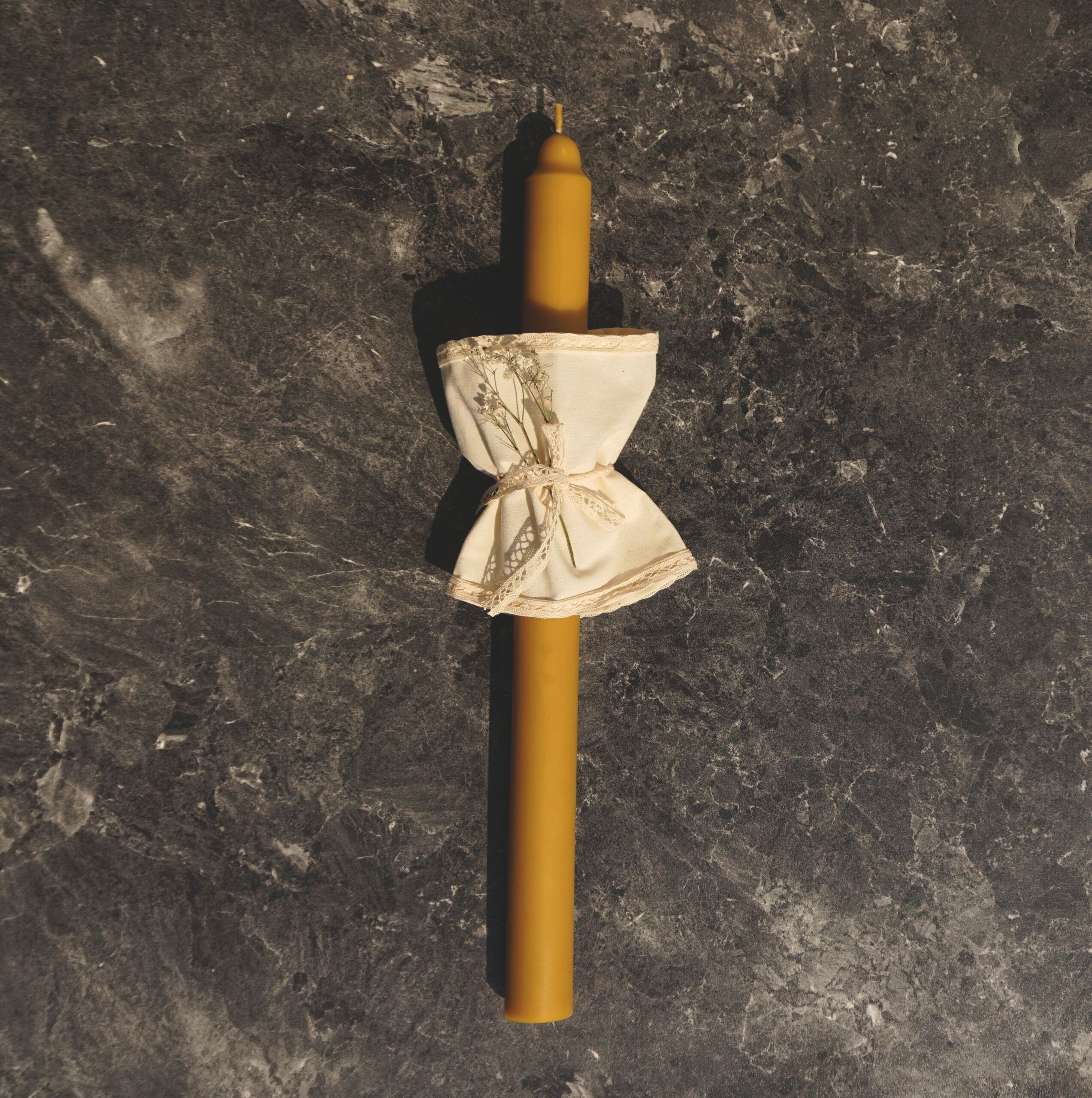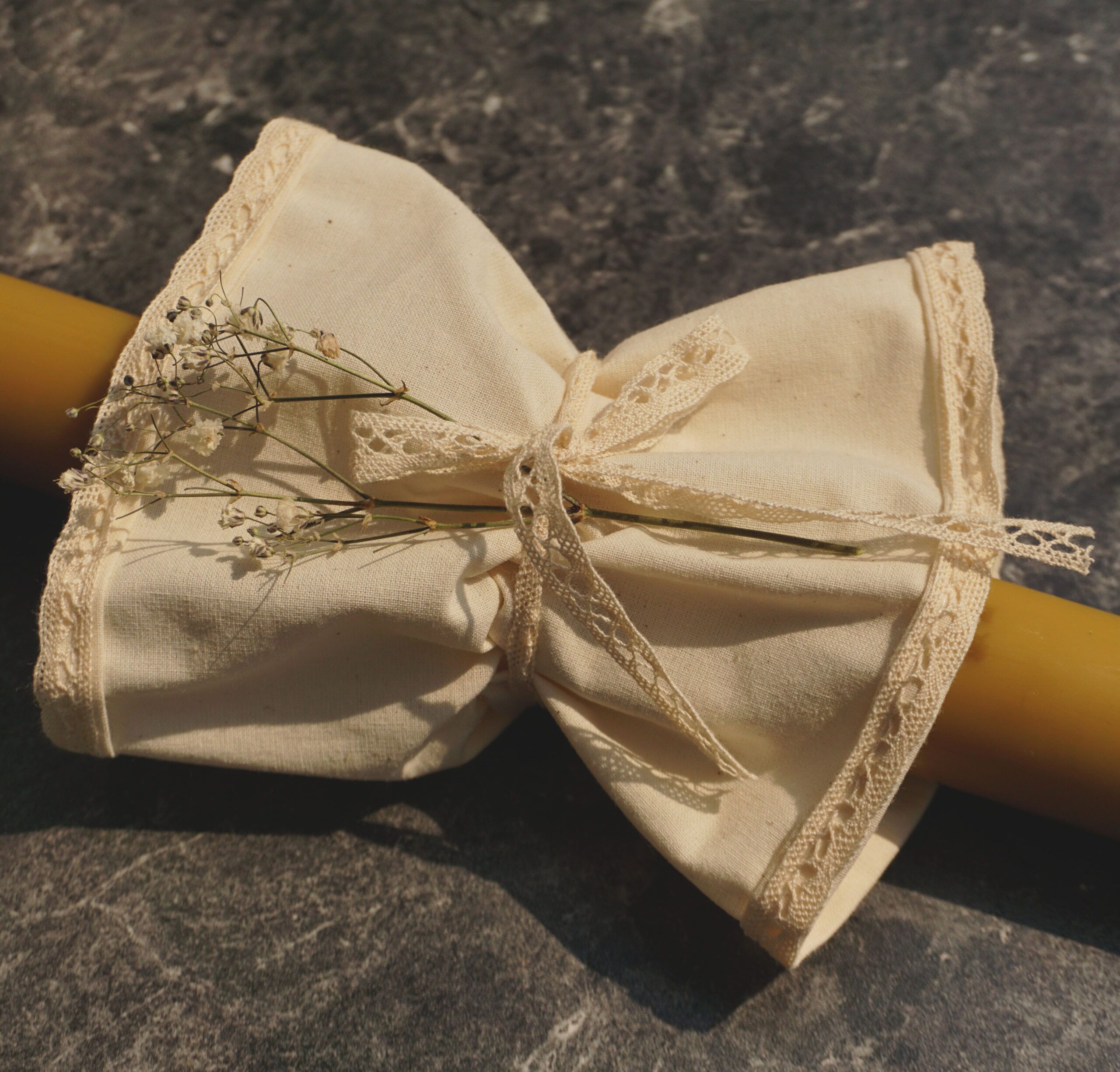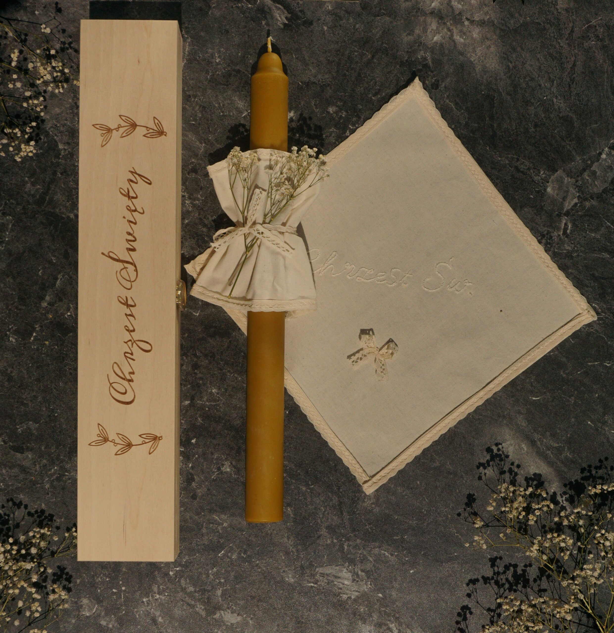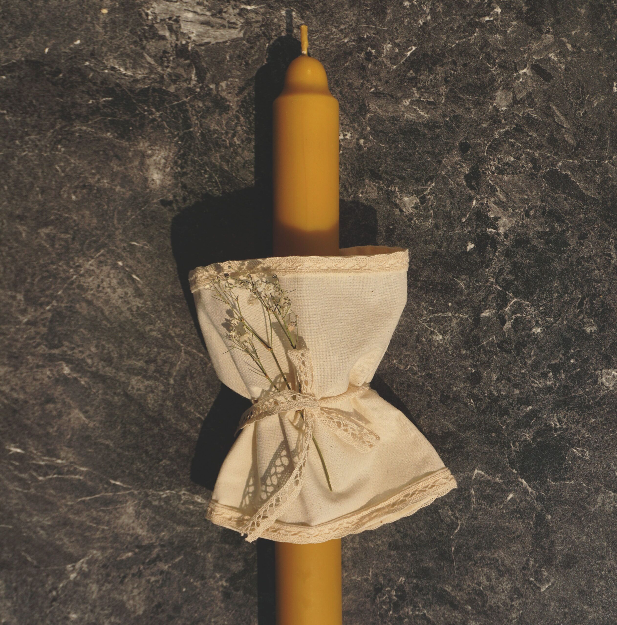 Świeca z bawełnianym knotem wykonana z czystego wosku pszczelego, bez żadnych dodatków. Dobrze komponuje się z ręcznie szytymi dodatkami – profitką i szatką z bawełny wykończonej koronką. My dodatkowo dodajemy suszoną gipsówkę, która dopełnia całość. Pani Magdalena z Fiu fiu pracownia ręcznie wyszyła na szatce napis “Chrzest Św.”