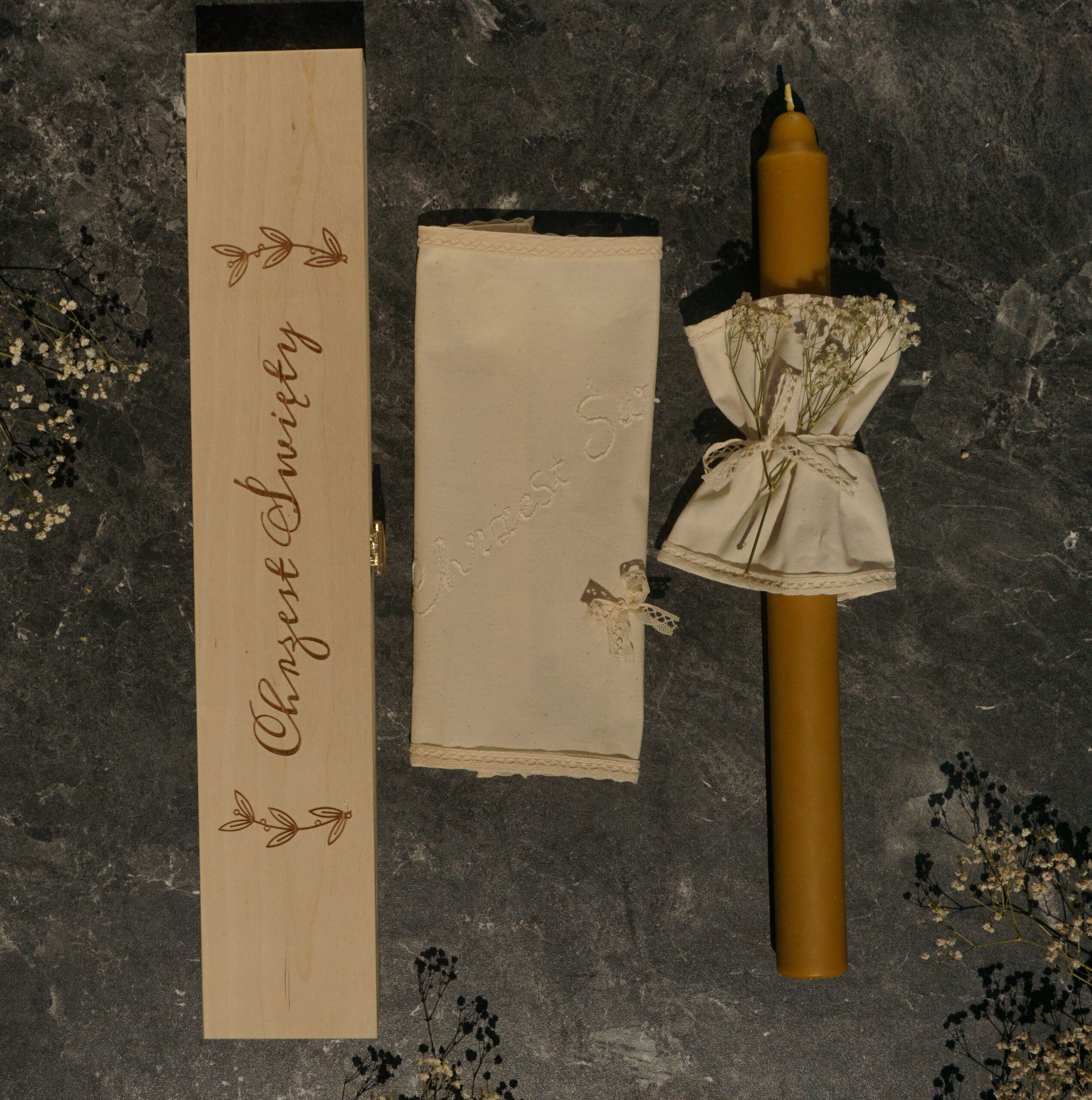 Ręcznie odlewana świeca z wosku pszczelego – gromnica z naszej pracowni w zestawie z kremowym bawełnianym okapnikiem, szatką i pudełkiem.