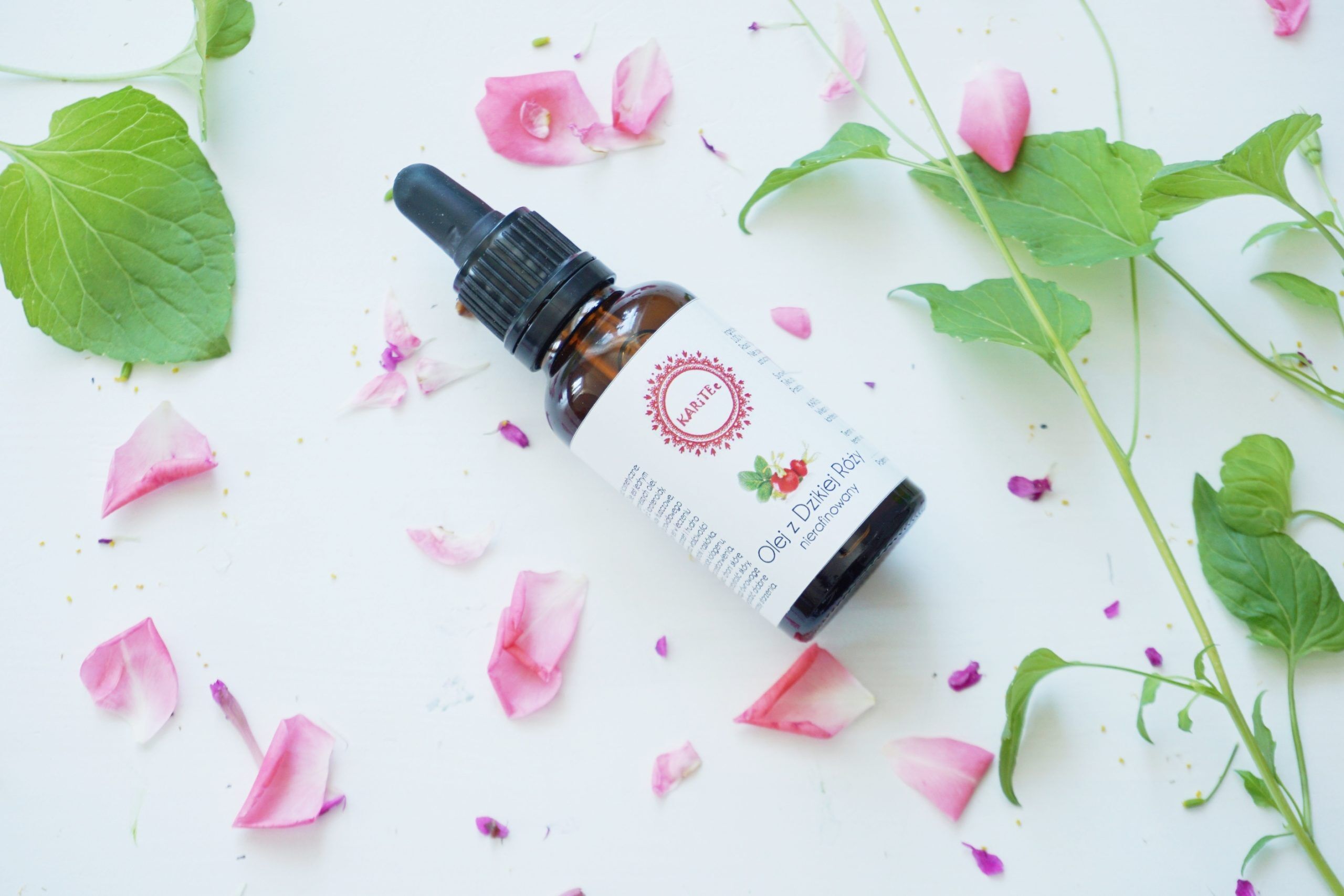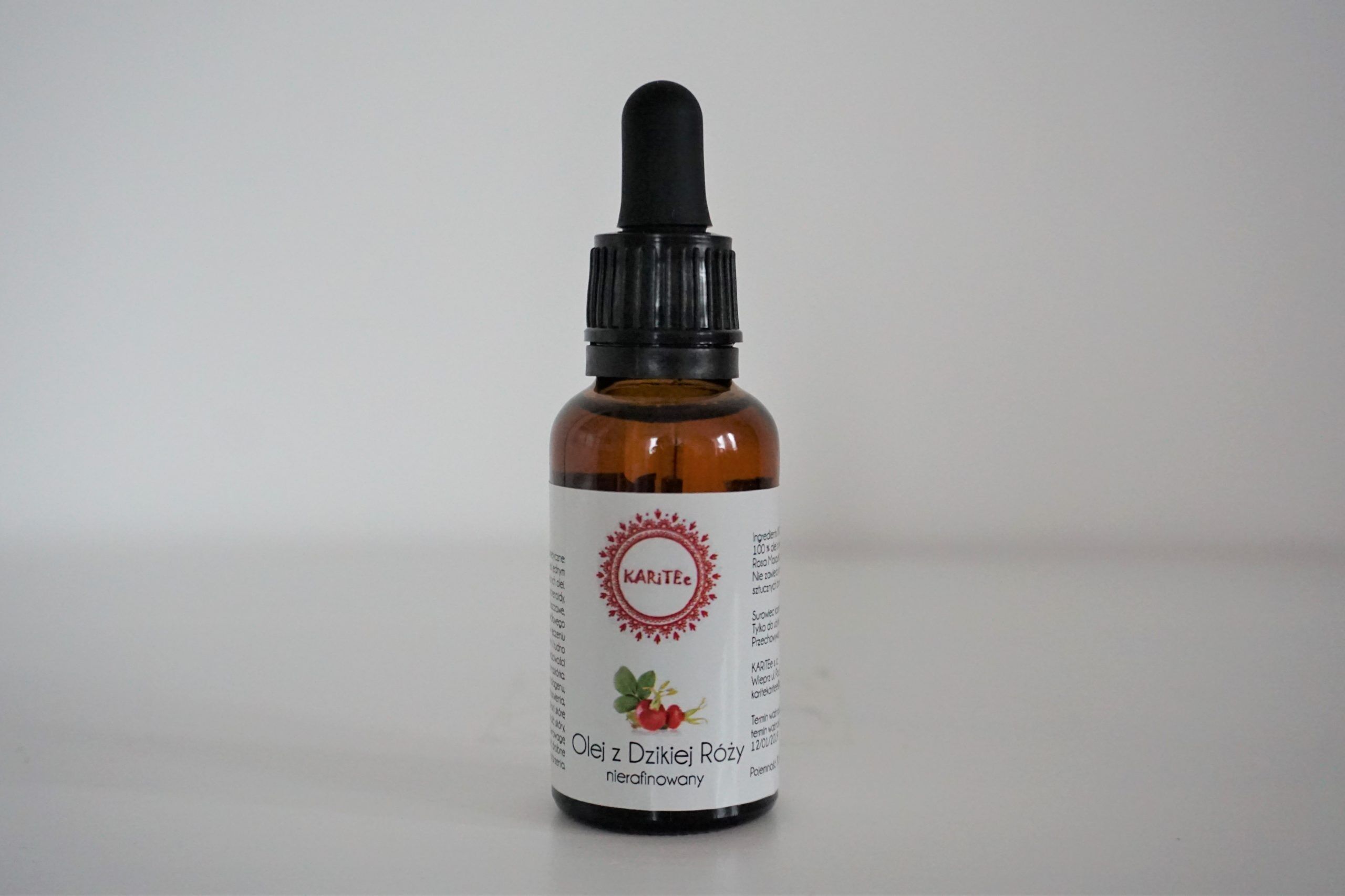 Olej tłoczony z nasion dzikiej róży odmiany Rosa Mosqueita, która rośnie w Chile. Jest to najcenniejszy surowiec ze wszystkich różanych olejów, obfituje w witaminę E, serole, karotenoidy oraz nienasycone kwasy tłuszczowe. Dziewczyny z manufaktury kosmetyków naturalnych Karitee wybrały ten olej, ponieważ posiada cenne właściwości odżywiające i regenerujące naskórek, wspomaga syntezę kolagenu, wygładza, łagodzi podrażnienia. Chroni skórę przed utratą wilgoci, wspomaga walkę z przebarwieniami. Olej wzmacnia naczynia krwionośne, więc osoby z cerą naczynkową znajdą w nim sprzymierzeńca. Wygładza drobne zmarszczki poprawiając napięcie skóry, a aktywne składniki chronią przed działaniem wolnych rodników.