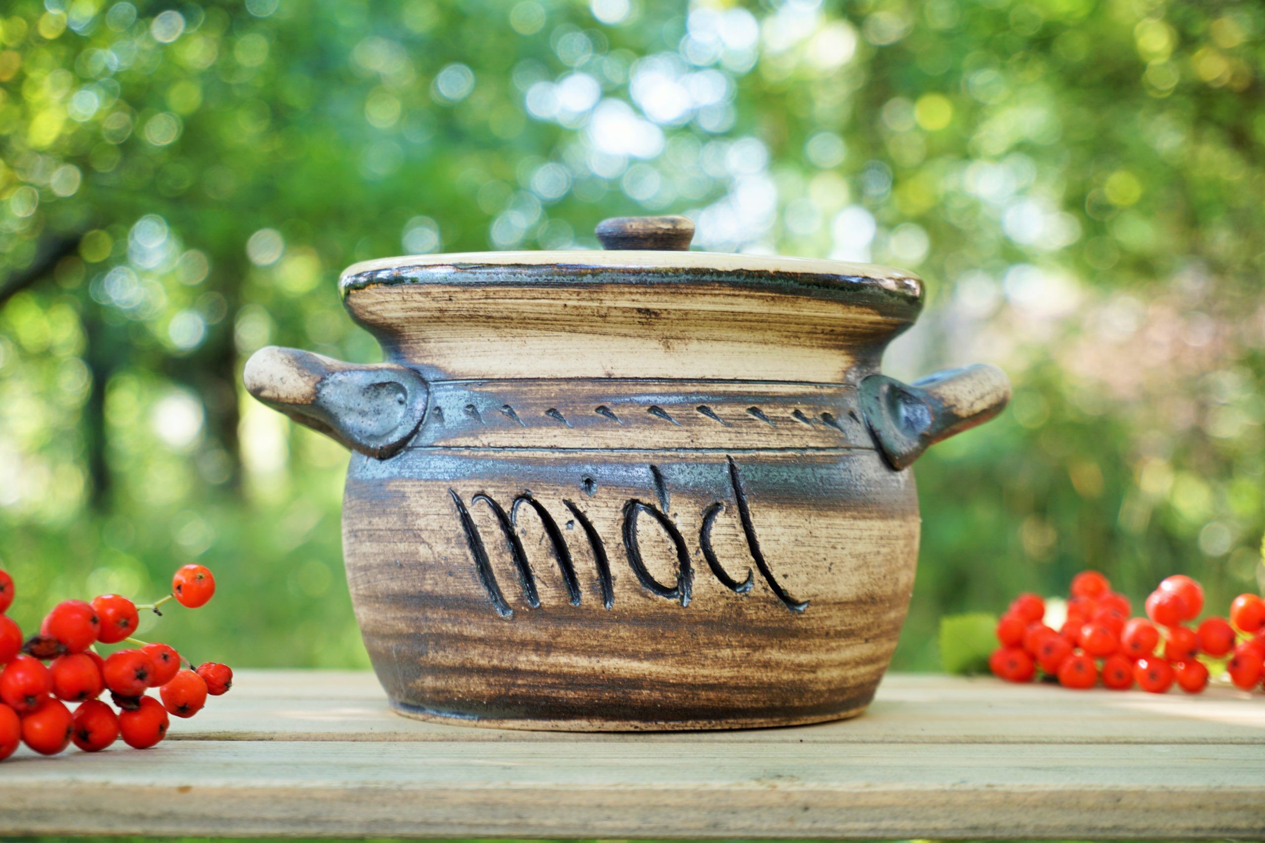 Dostępny tutaj produkt został wykonany ręcznie przez specjalizującego się w garncarstwie Pawła Boguckiego, dzięki czemu cechują go niepowtarzalność i oryginalność. Garnek ten można polecić każdemu – jest on w pełni ekologiczny, a także zdrowy i bezpieczny w użytku, gdyż nie zawiera żadnych szkodliwych substancji. Jego dużą zaletą jest nietypowy design w stylu retro – naczynie utrzymane jest w kolorach brązu i beżu, natomiast z przodu został na nim umieszczony napis „miód”. Garnek może stanowić doskonałą ozdobę każdego pomieszczenia, będzie pasował zarówno do domowej kuchni, jak i wnętrza góralskiej restauracji czy przytulnej knajpki. Oprócz tego spełni on oczywiście również funkcję praktyczną – doskonale nada się do przechowywania różnego rodzaju produktów spożywczych. Z powodzeniem możesz w tym naczyniu umieścić na przykład warzywa czy masło – choć, rzecz jasna, najlepiej trzymać w nim miód!
