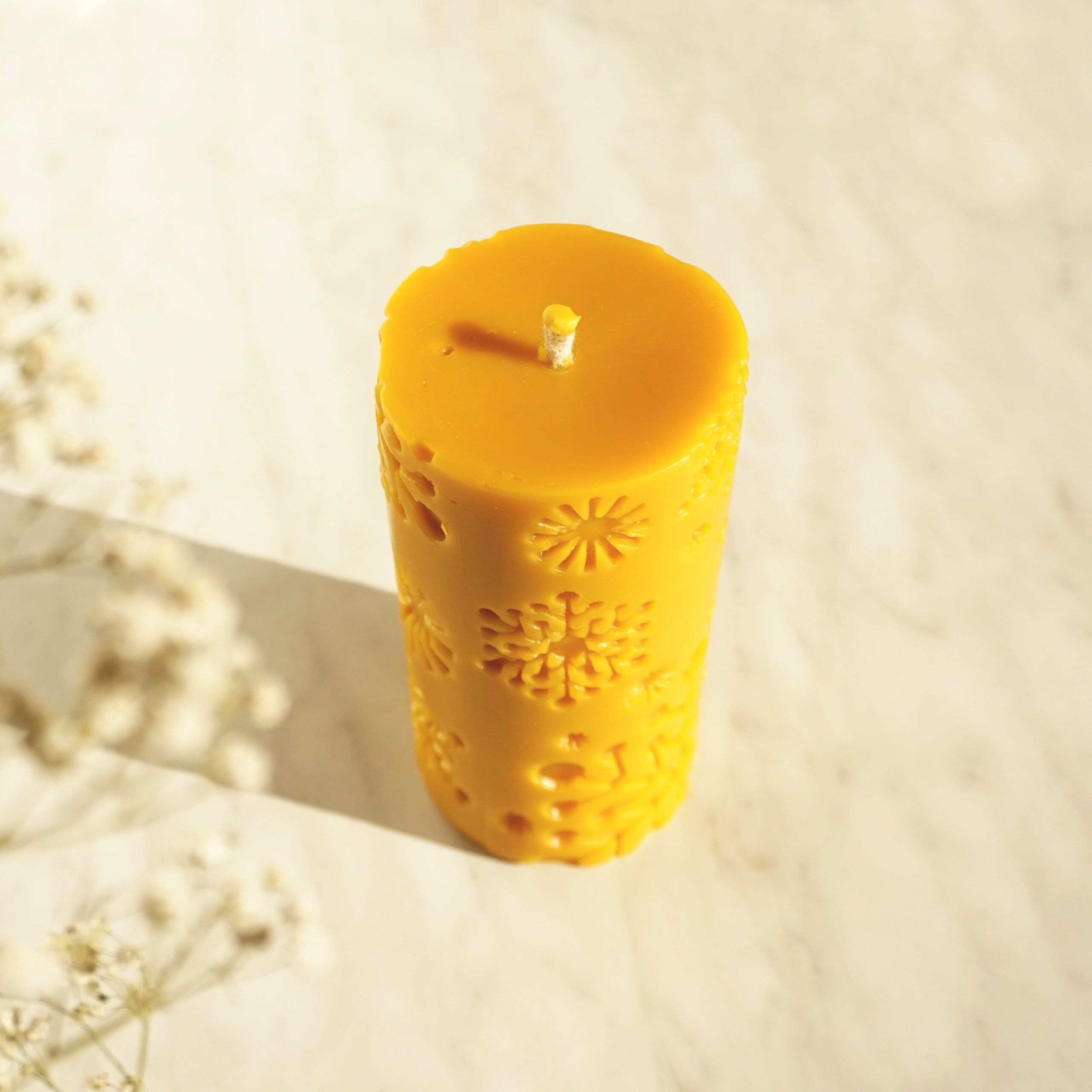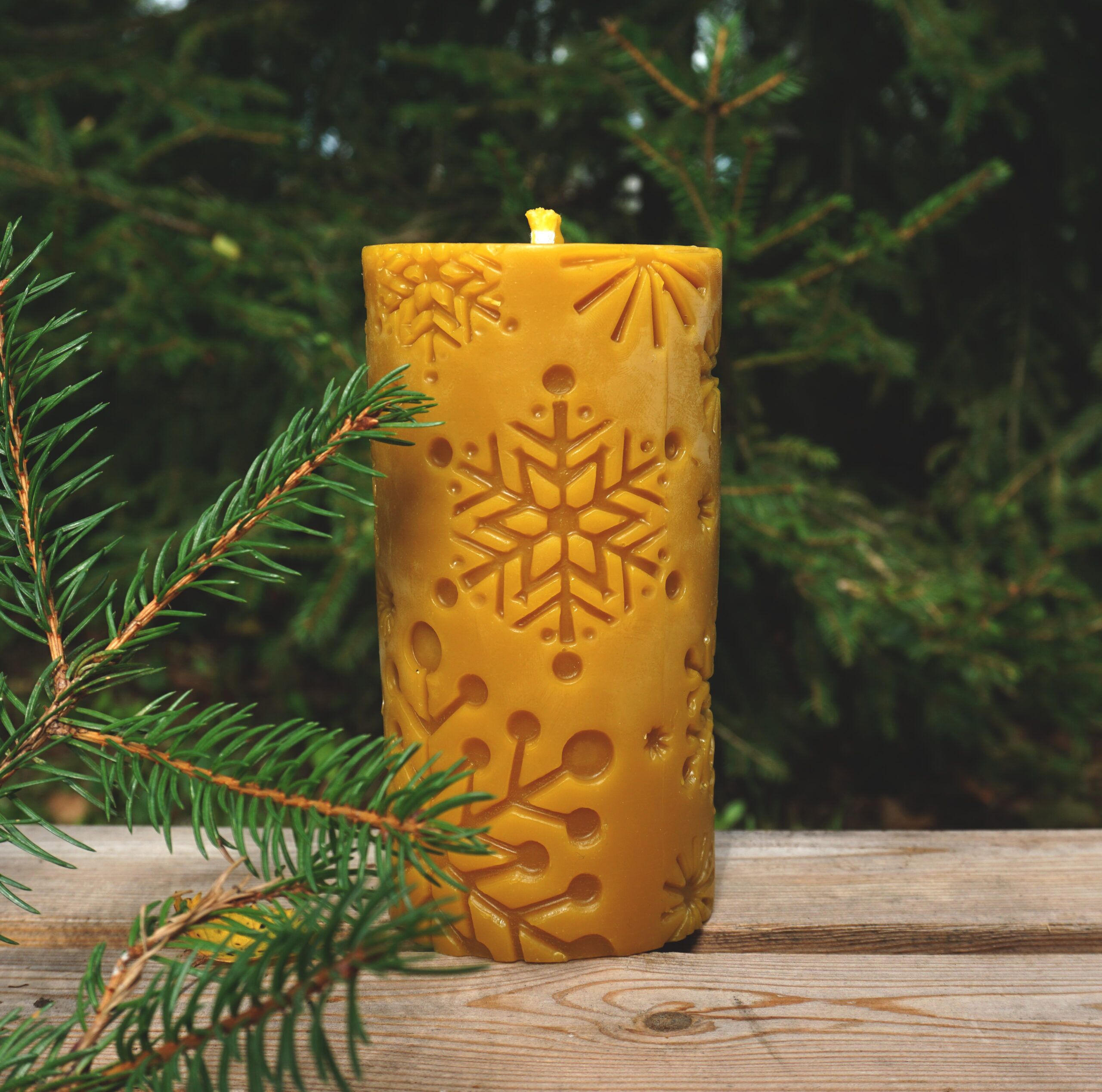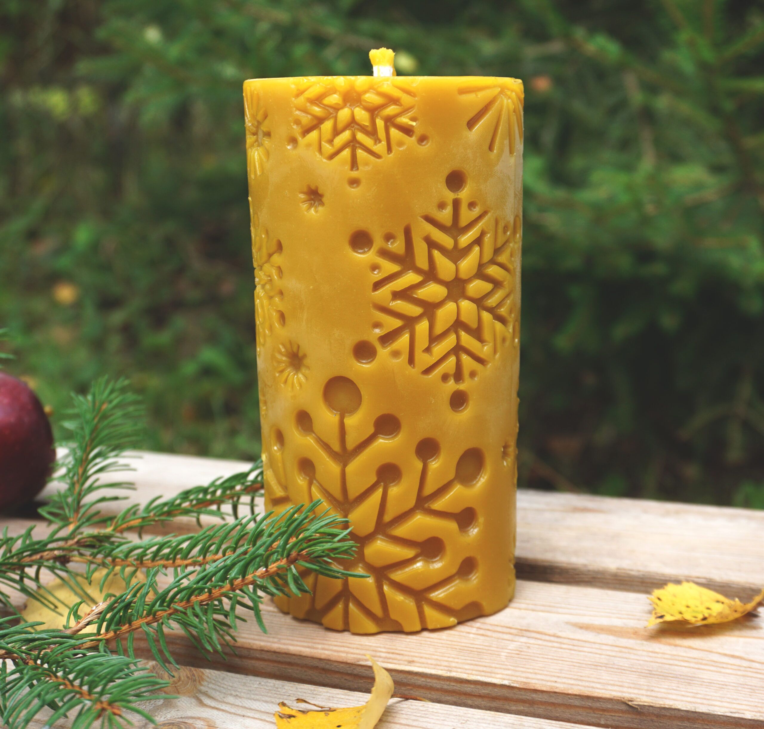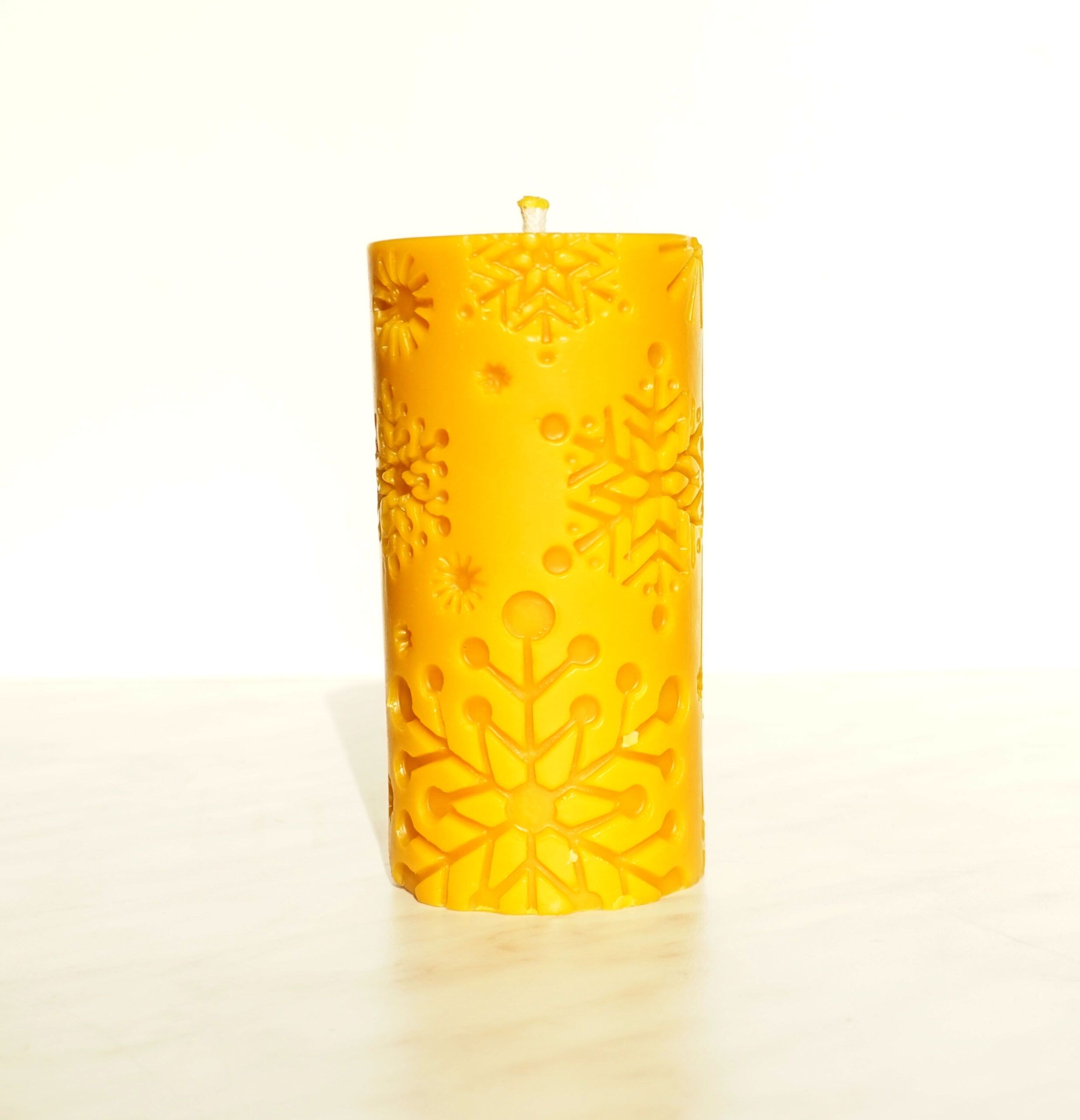 Ręcznie odlewana świeca z czystego wosku pszczelego prosto z polskiej pasieki. Świeca pokaźnych rozmiarów sprawdzi się jako ozdoba świątecznego stołu. Ma kształt walca z motywem płatków śniegu, który podkreśla świąteczną atmosferę. Świeca pali się ciepłym płomieniem, ma bawełniany knot.