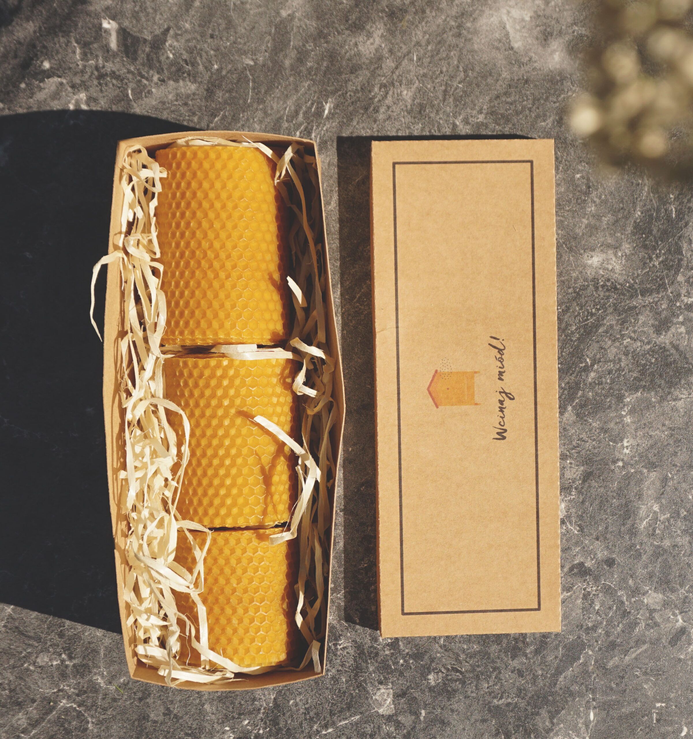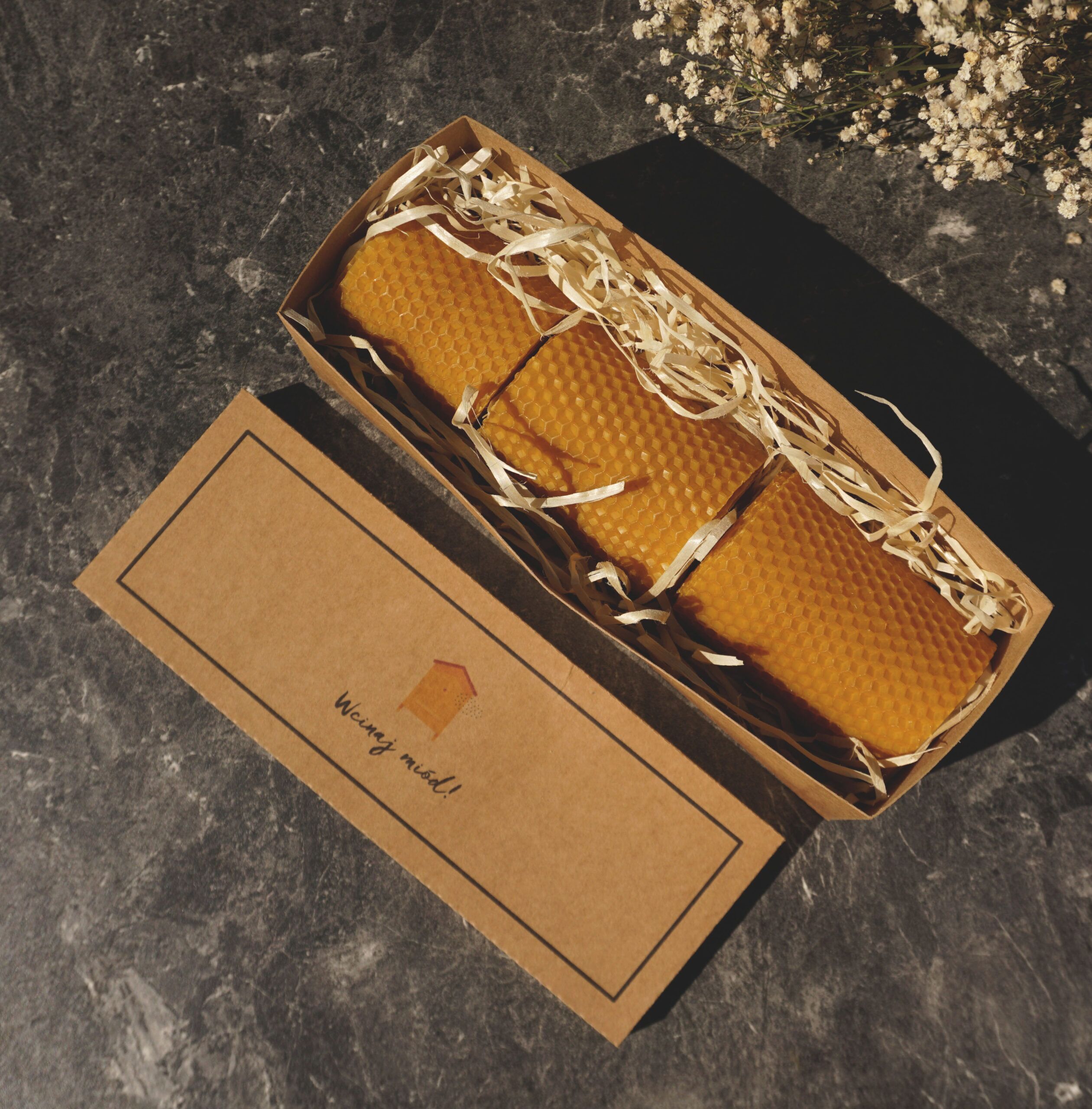 Pakujemy je w kartonowe pudełko z wieczkiem, na którym znajduje się nasze logo. Wnętrze wypełniamy wełną drzewną.