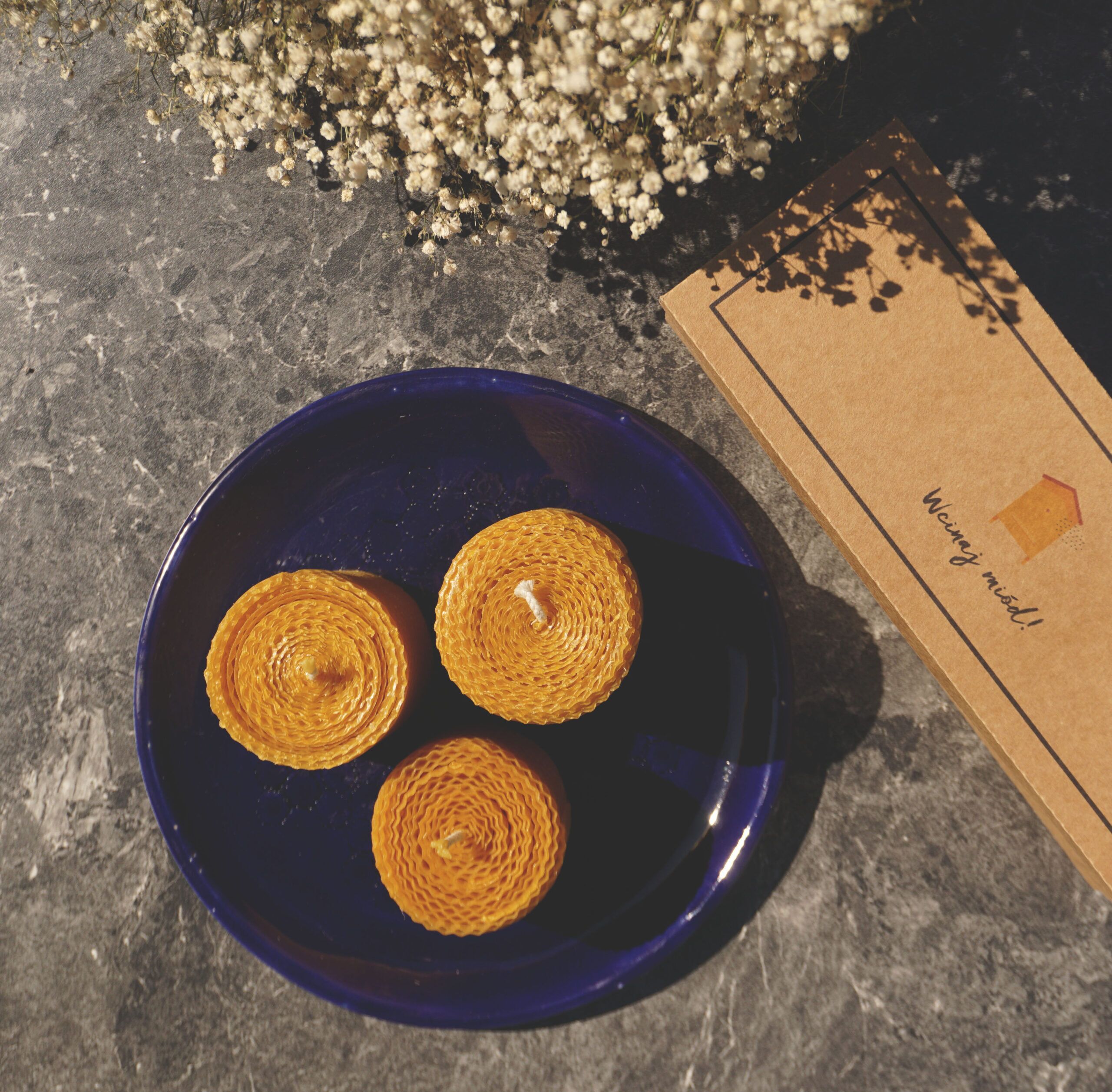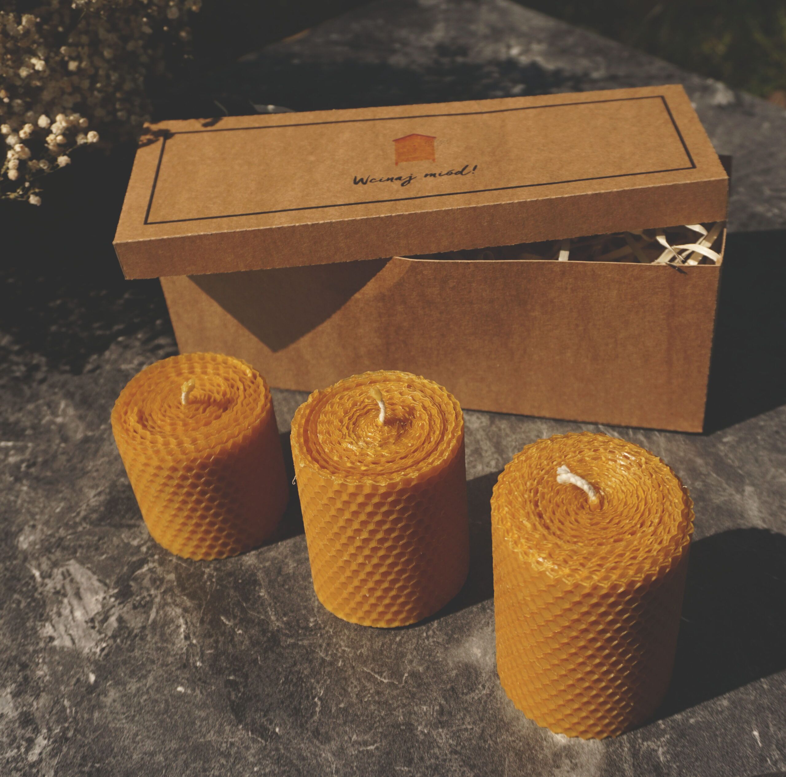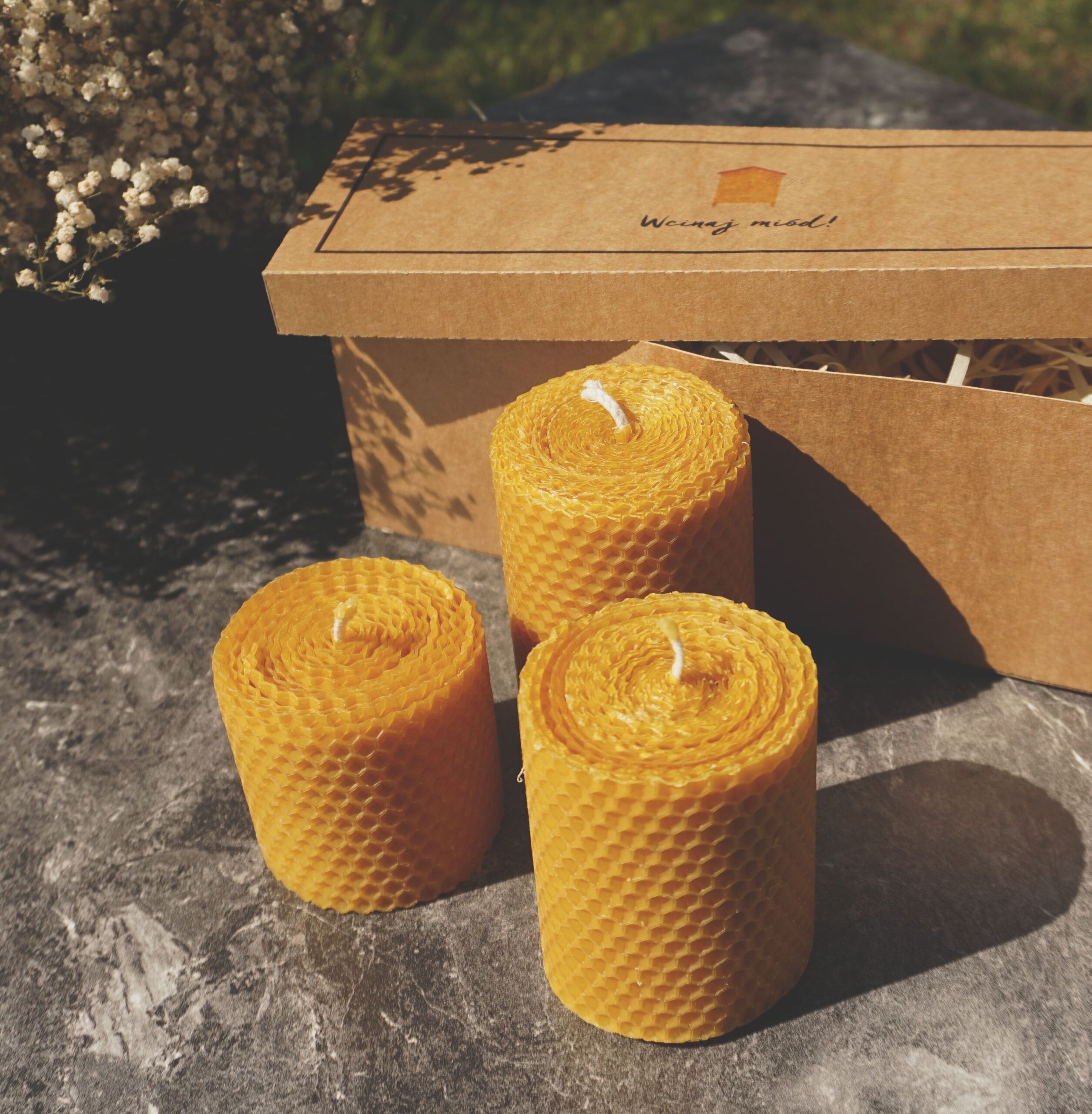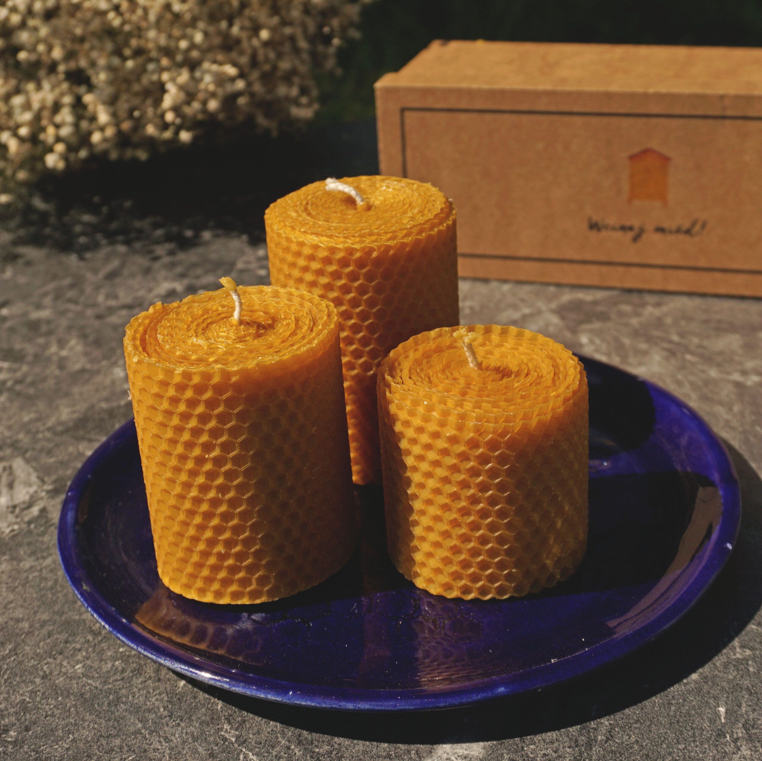 Zestaw trzech ręcznie zwijanych świec z węzy pszczelej z bawełnianymi knotami. Świece przygotowaliśmy w trzech wysokościach: 6.5cm, 8 cm i 9 cm, wszystkie mają średnicę ok. 6 cm.