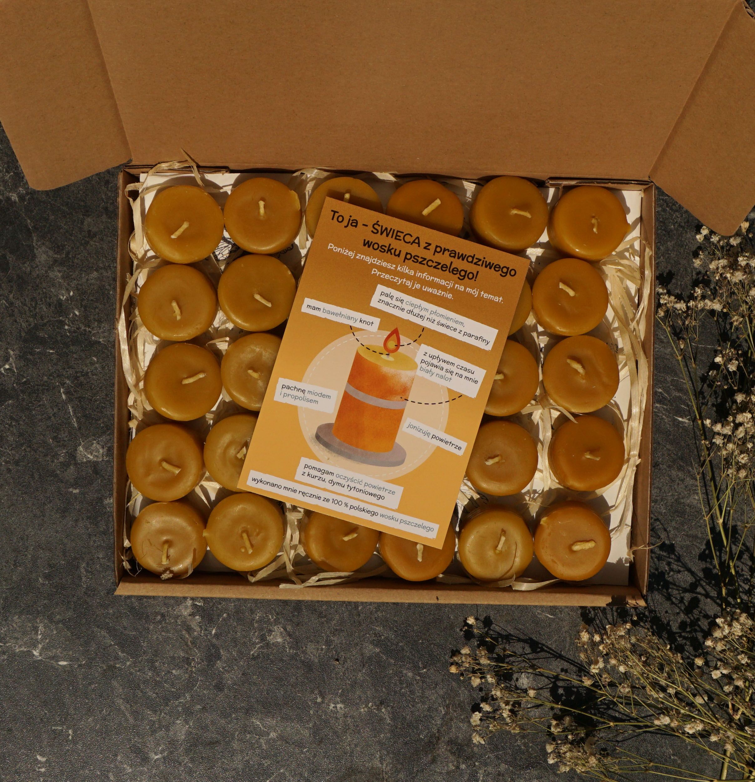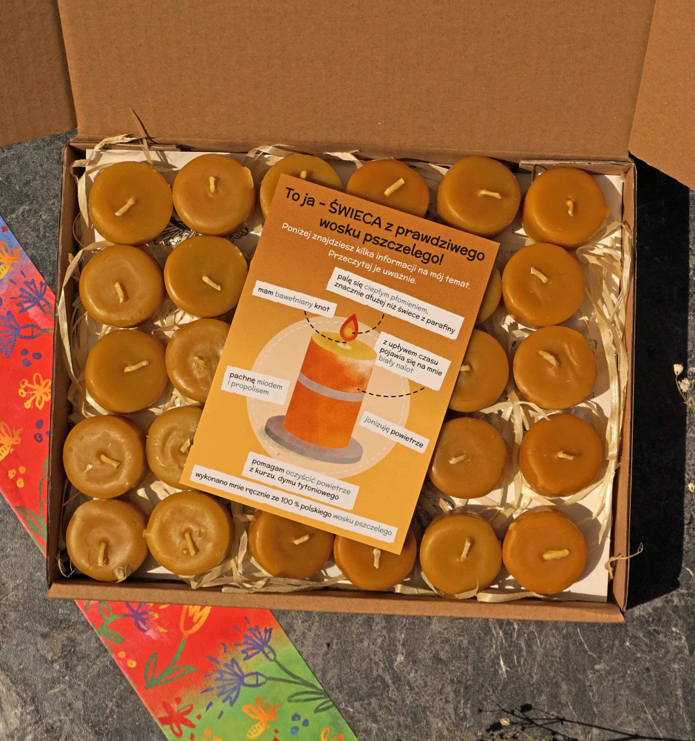 Zestaw 60 podgrzewaczy odlanych z wosku pszczelego z bawełnianymi knotami. Świeczki zapakowaliśmy w fasonowe pudełko z owijką z motywem pszczelim.